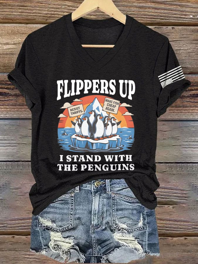 V-Neck Retro Flippers Up I Stand With The Penguins Resist Tariffs Print T-Shirt
